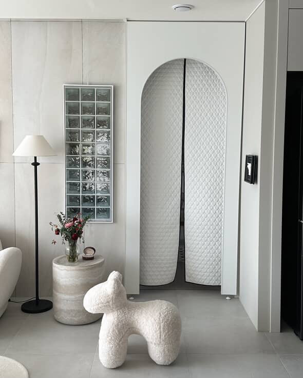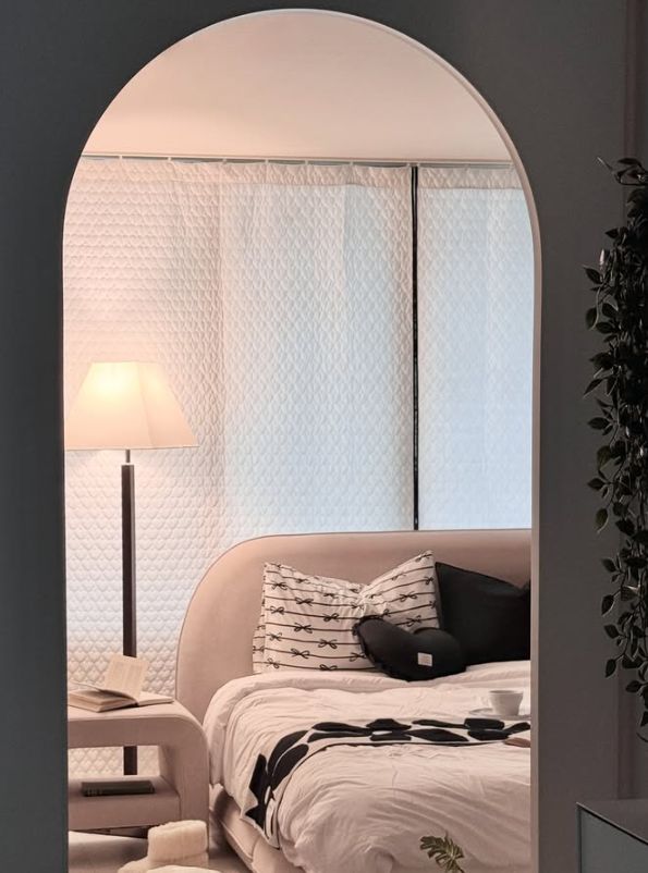 침실 반대편 창으로 들어오는 외풍도 막아줄겸 아치형 문에 가리개 커튼처럼 달아주니 공간분리까지 되서 더 아늑한 느낌